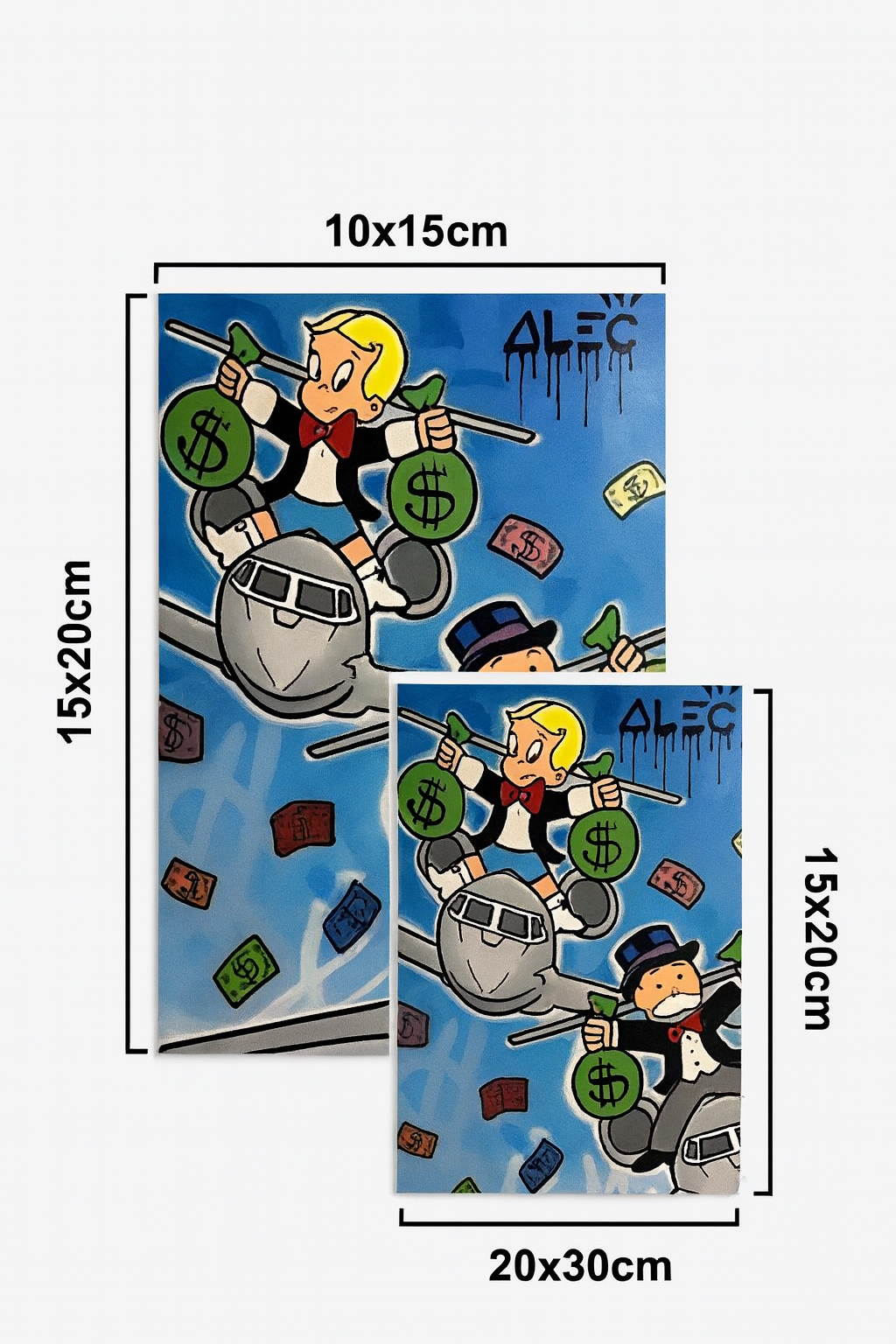 Capital Mischief is a digital graffiti masterpiece merging two legends of cartoon capitalism Richie Rich and Mr. Monopoly in a riot of color, cash, and cheeky rebellion. Inspired by the streetwise flair of Alec Monopoly, this art print blends humor, hustle, and high-art parody for the modern collector.