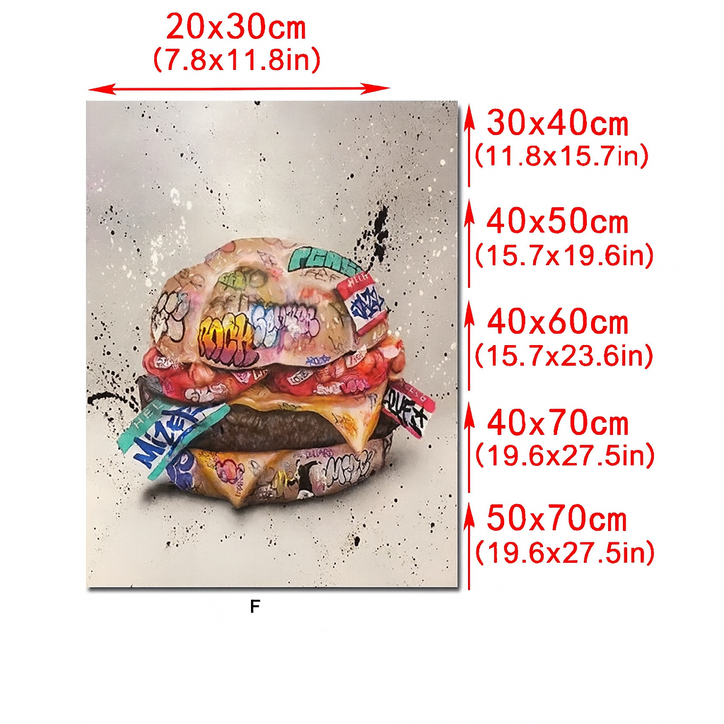 Hungry for Art is a vibrant, oversized canvas that transforms a classic burger into a larger-than-life pop art statement. Featuring bold graffiti-inspired style and 3D design elements, this piece adds a fun, edgy twist to kitchens, dining areas, game rooms, or creative spaces.
