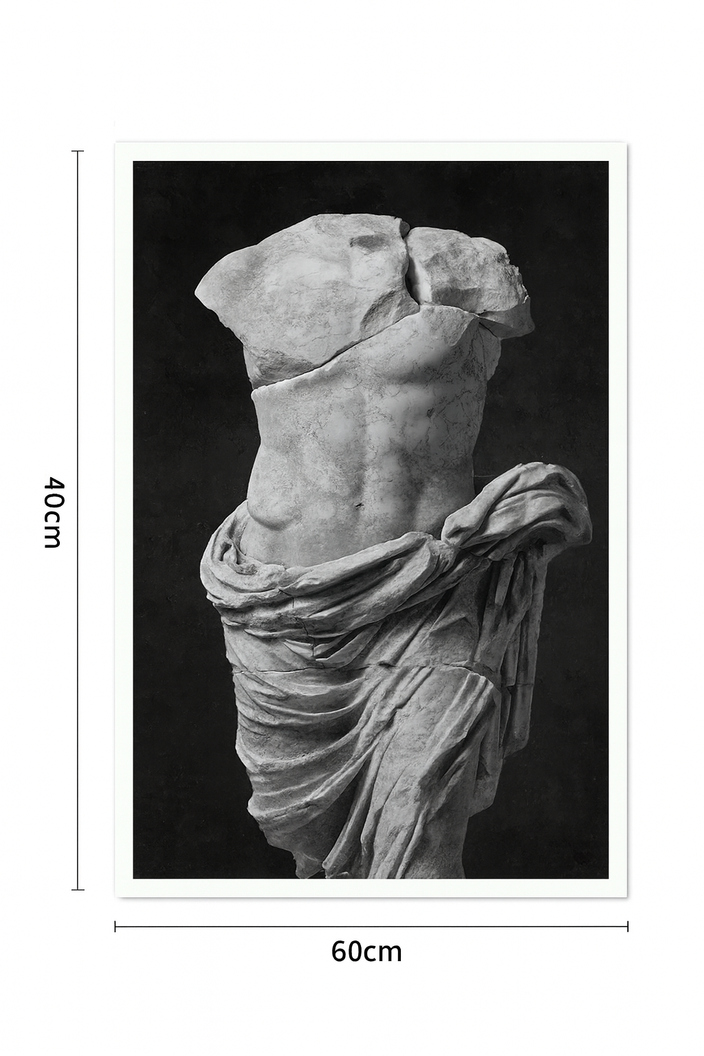 – Features a Greco-Roman bust with artful cracks and muted tones