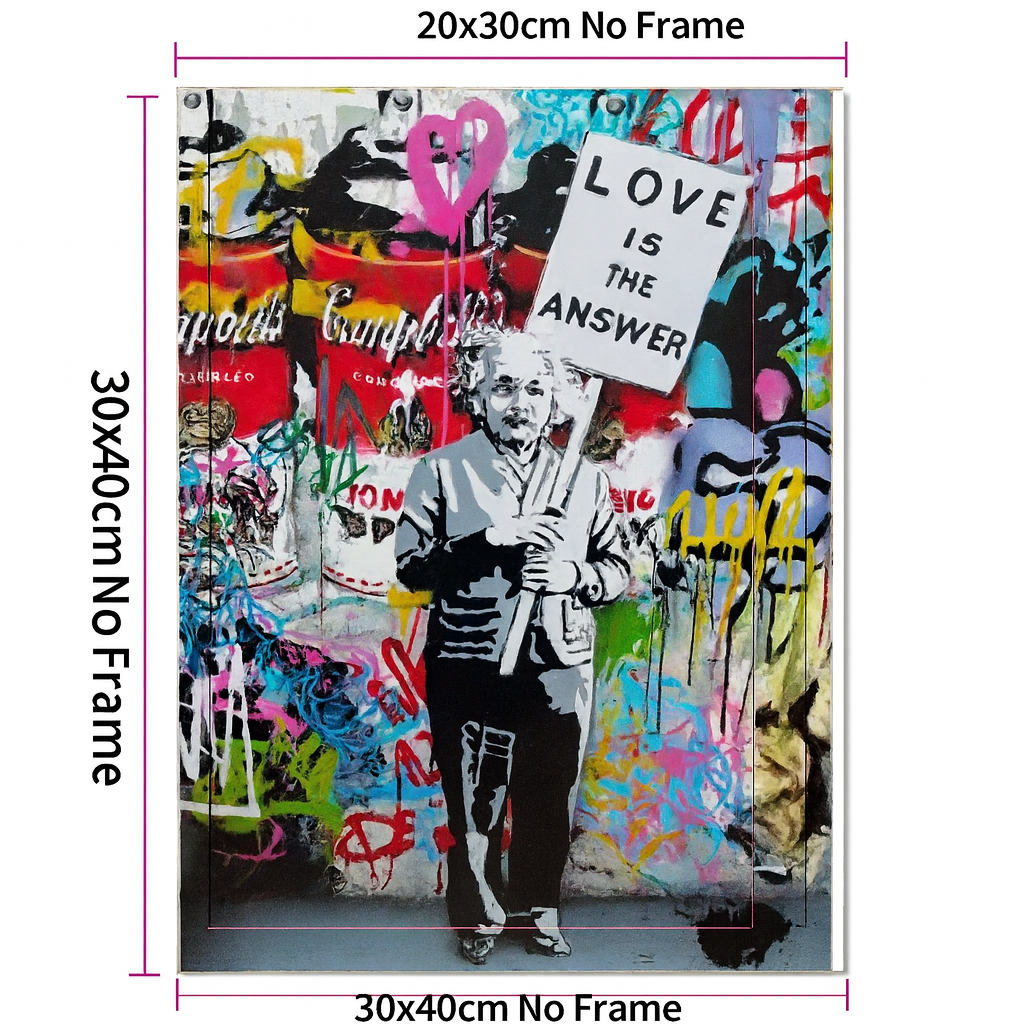Answer in Red transforms Banksy’s iconic Love Is the Answer protest into a quiet revolution for your walls. Featuring Einstein gentle genius turned street prophet this piece doesn't demand your attention. It earns it, whispering that even the brightest minds know: love is the only equation that matters.