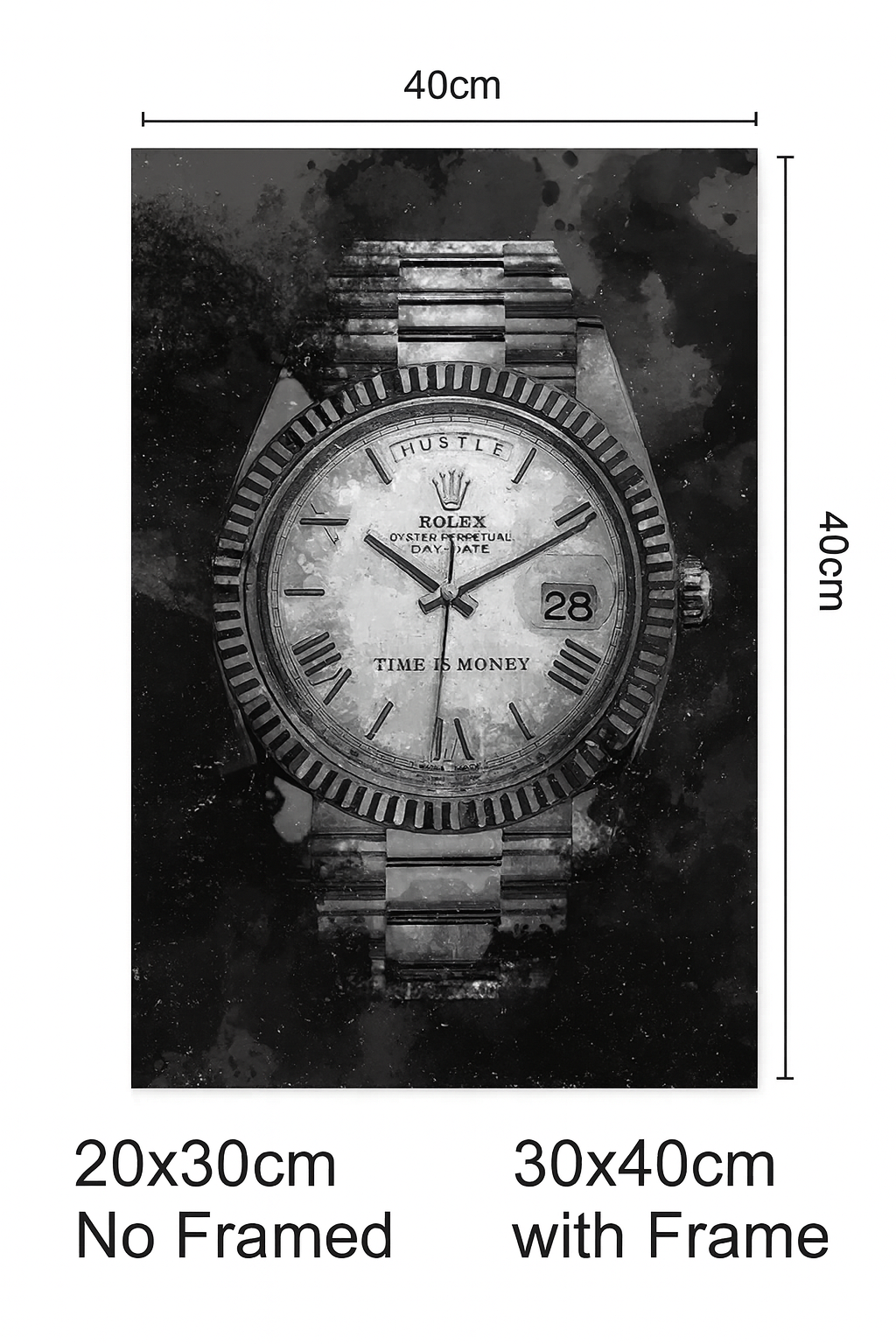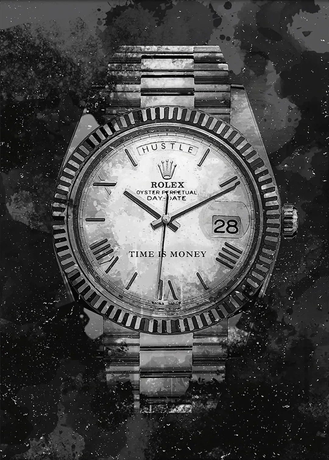 In the heartbeat of the city, every second demands reverence. “Sovereign Seconds” is more than wall art. It’s an anthem for those who wear ambition like armor. Rendered in stark black and white, a Rolex close-up becomes a totem of earned triumph. Above, HUSTLE commands respect. Below, TIME IS MONEY insists on action. Printed on gallery-wrapped canvas with museum-grade ink and a sturdy 1½″ birch frame, this piece fuses urban edge with cultural pride, reminding you that your grind is a legacy in motion.