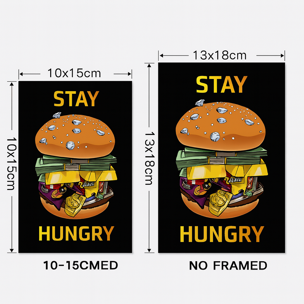The Wealth Stack is a surreal feast of luxury diamonds, gold, car keys, and Bitcoin all layered between golden buns. This framed canvas turns your wall into a visual metaphor for hustle, abundance, and the modern appetite for success.