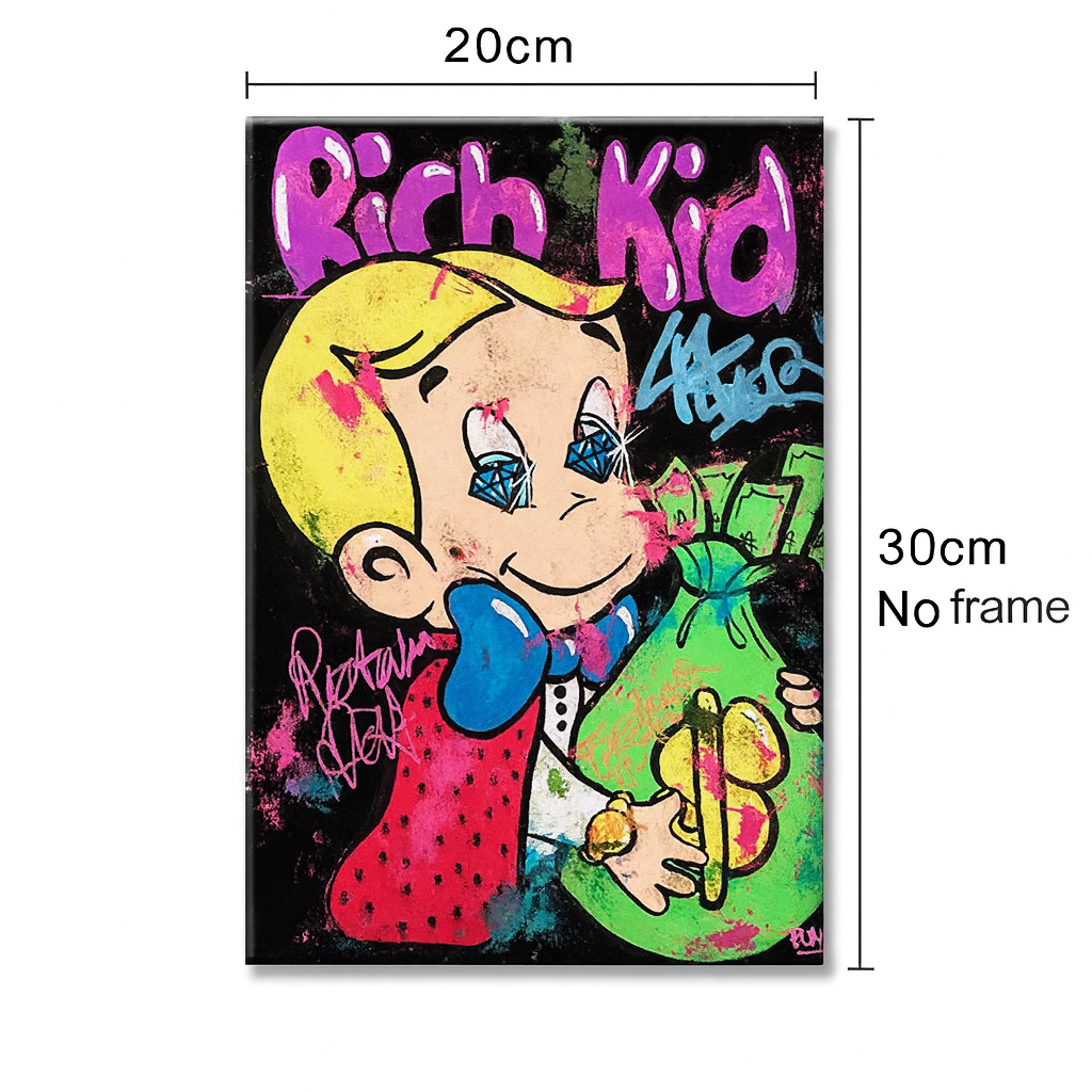 Richie Dollars is where playful meets powerful. This graffiti-style canvas merges the iconic flair of Alec Monopoly with the charm of Richie Rich layered in abstract textures, dollar signs, and bold street energy. It’s the perfect mix of cartoon nostalgia and modern wealth culture.