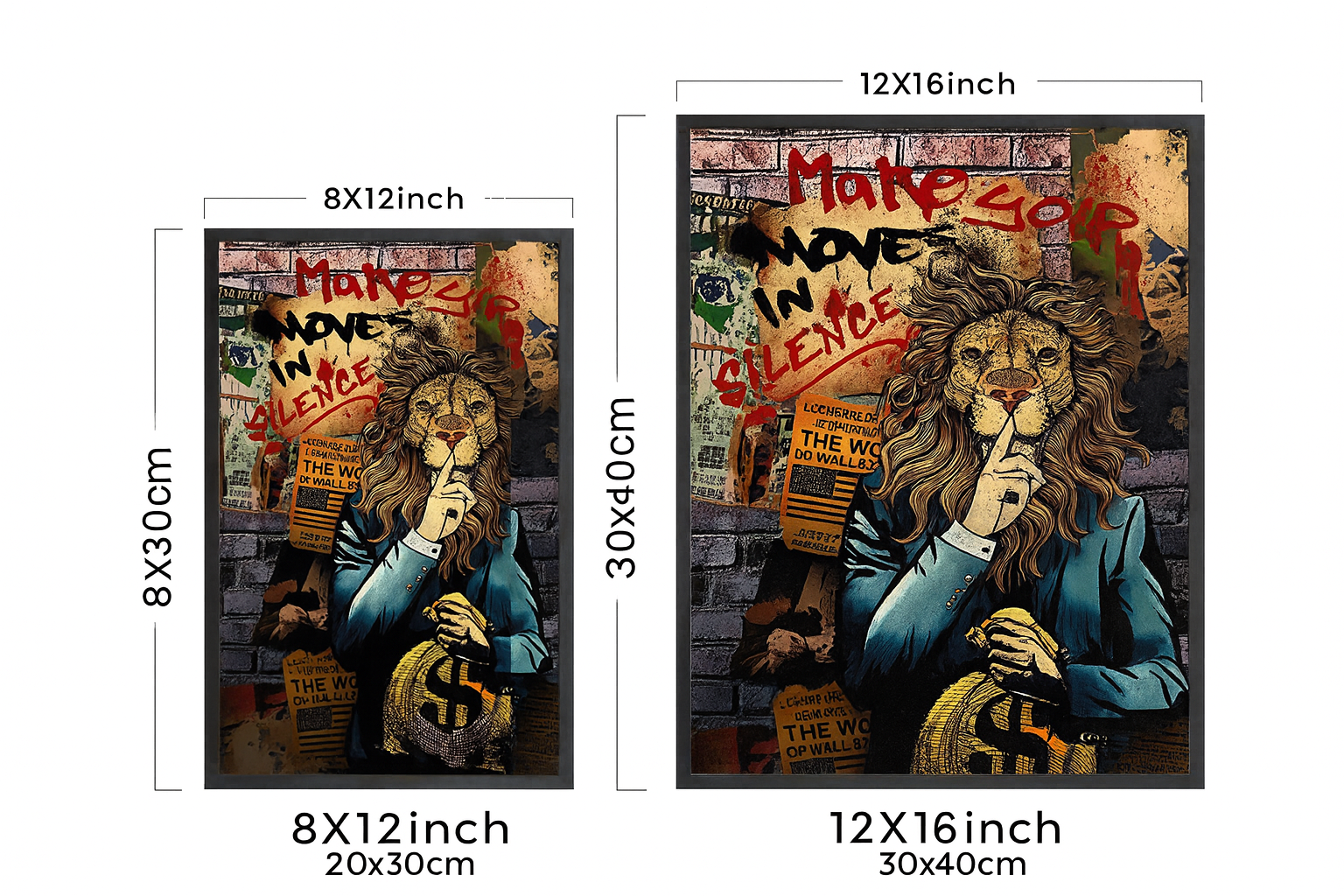 Silent Power fuses the commanding presence of a lion in a sharp suit with the raw energy of hustle culture. Paired with the “Make Moves in Silence” mantra and stacked money bag visuals, this street-style canvas fuels confidence, ambition, and unshakable focus.