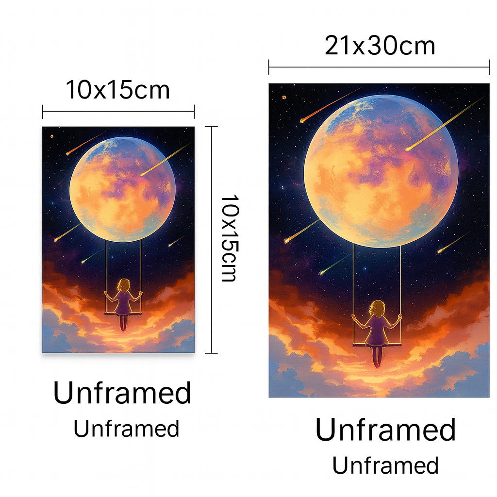Lunar Drift captures the delicate wonder of a girl swinging beneath a glowing moon weightless, timeless, free. This piece is a soft meditation on innocence, solitude, and the quiet magic of night. It's not just a scene it's a feeling caught mid-air.