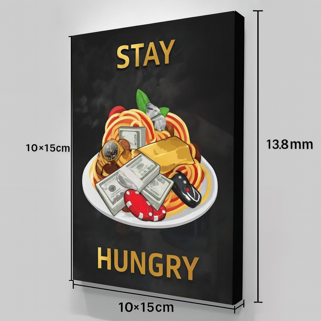 This eye-popping “STAY HUNGRY” canvas blends surreal creativity with street-smart grind. Twisted strands of spaghetti, soaked in gold and cash symbolism, deliver a visual reminder that success is served only to the relentless.
